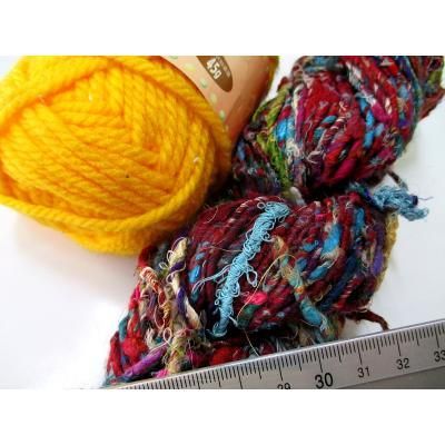 ◎シルクのサリーなどの半端生地を裂いて糸状にして手で紡いだ糸です。(一般に、リサイクル毛糸と呼ばれています)