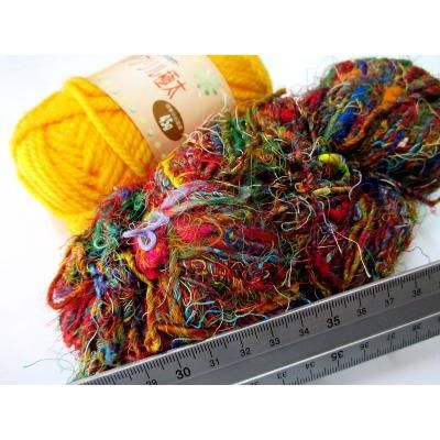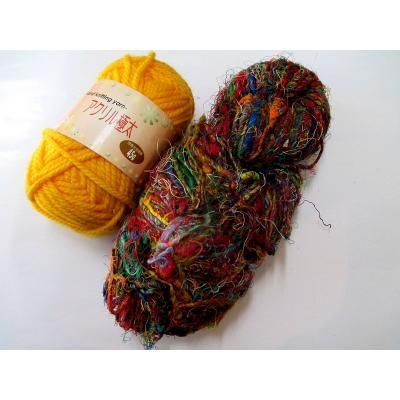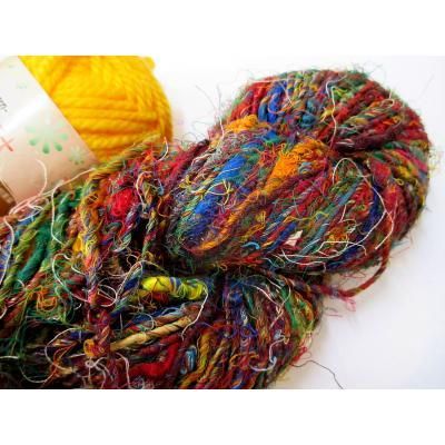 ◎シルクのサリーなどの半端生地を裂いて糸状にして手で紡いだ糸です。(一般に、リサイクル毛糸と呼ばれています)