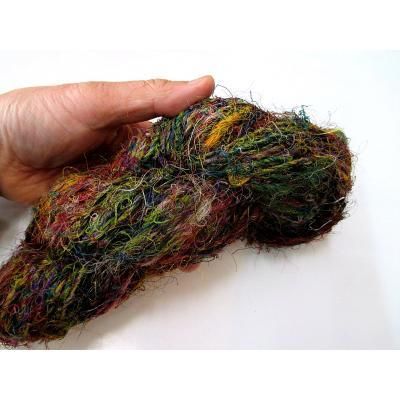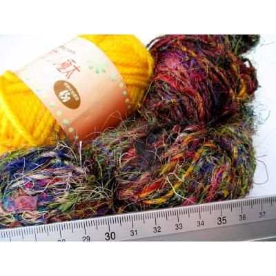 ◎シルクのサリーなどの半端生地を裂いて糸状にして手で紡いだ糸です。(一般に、リサイクル毛糸と呼ばれています)