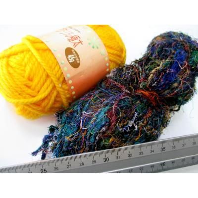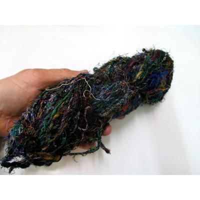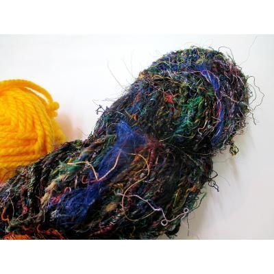 ◎シルクのサリーなどの半端生地を裂いて糸状にして手で紡いだ糸です。(一般に、リサイクル毛糸と呼ばれています)