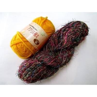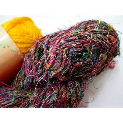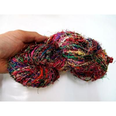◎シルクのサリーなどの半端生地を裂いて糸状にして手で紡いだ糸です。(一般に、リサイクル毛糸と呼ばれています)