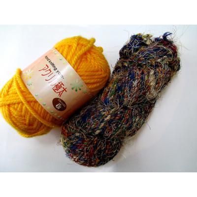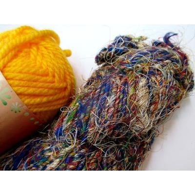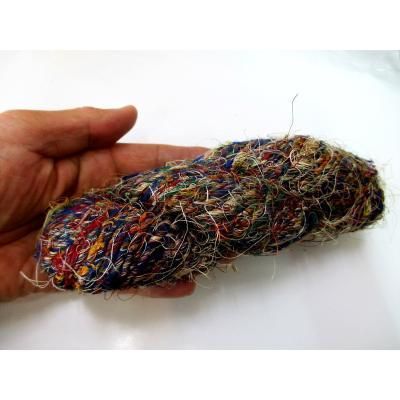 ◎シルクのサリーなどの半端生地を裂いて糸状にして手で紡いだ糸です。(一般に、リサイクル毛糸と呼ばれています)