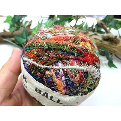 ◎シルクのサリーなどの半端生地を裂いて糸状にして紡いだ糸です。(一般に、リサイクルシルク毛糸、ユーズドシルクと呼ばれています)
