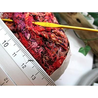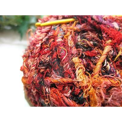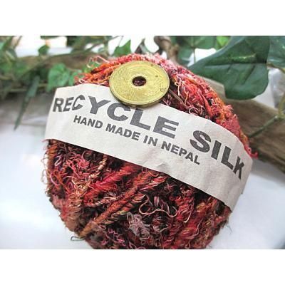 ◎シルクのサリーなどの半端生地を裂いて糸状にして紡いだ糸です。(一般に、リサイクルシルク毛糸、ユーズドシルクと呼ばれています)