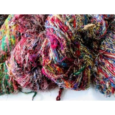 ◎シルクのサリーなどの半端生地を裂いて糸状にして紡いだ糸です。(一般に、リサイクルシルク毛糸、ユーズドシルクと呼ばれています)